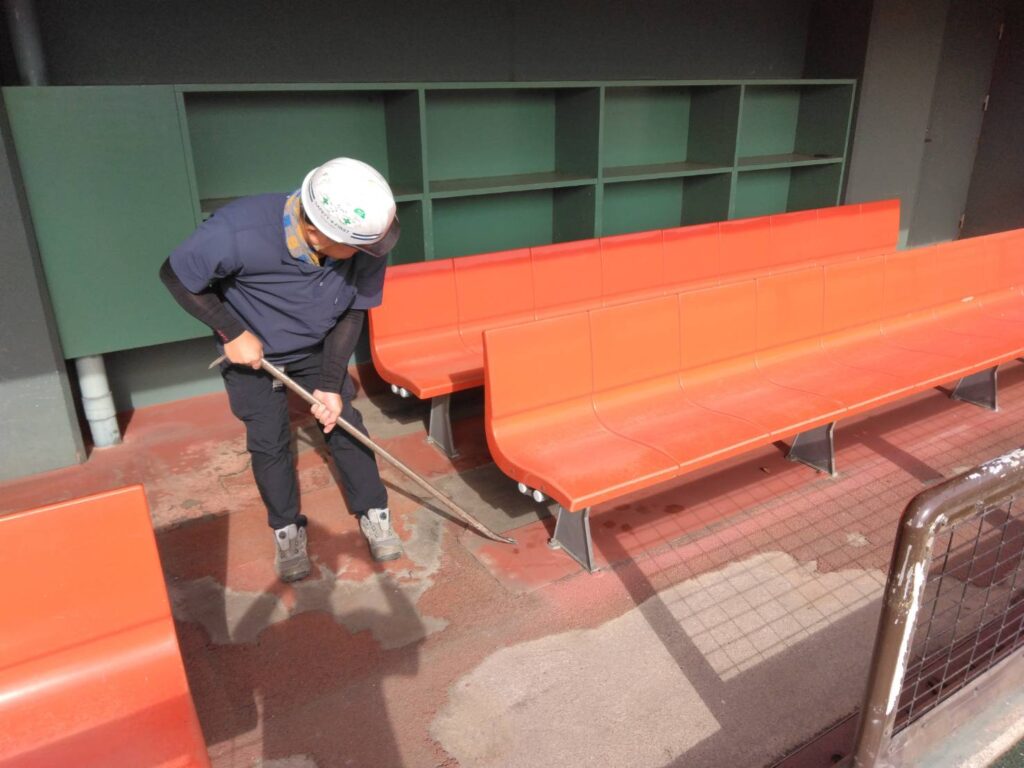 ダックアウトの床にゴムチップがシートみたいにひいてありますが、それを取る作業です!
