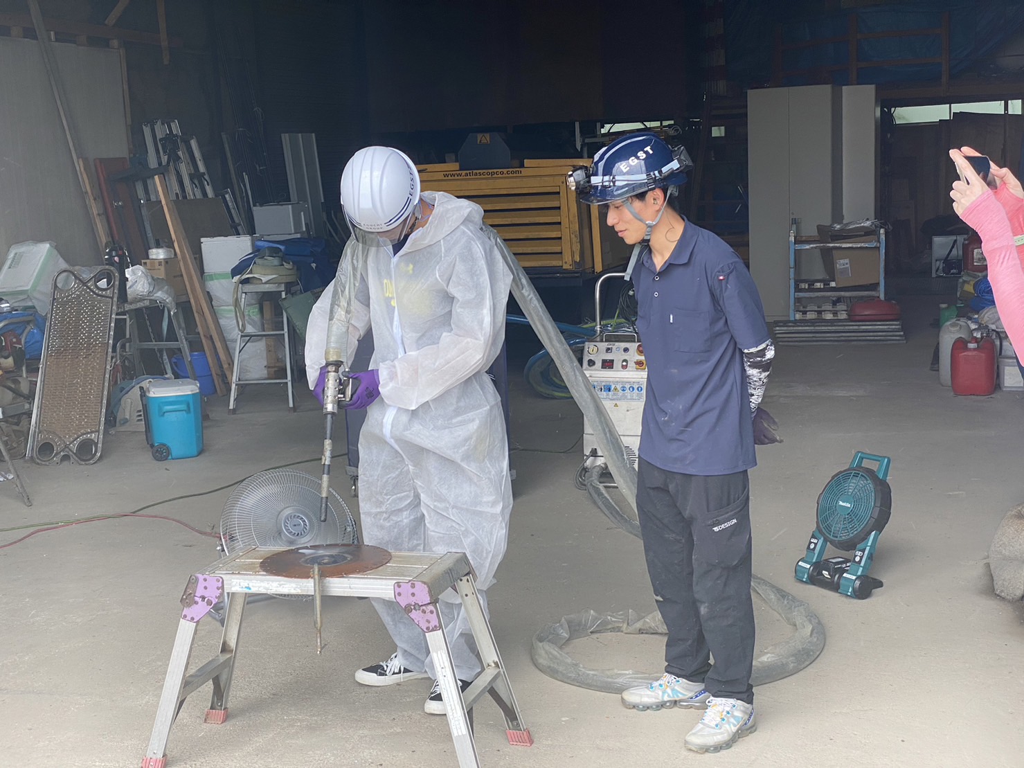 ドライアイス洗浄を上司の村上さんや先輩の刀祢さんに教えてもらいながら体験をしました。汚れが徐々に落ちていくのを見ていたらとても気持ちがいいなと思いました(笑)