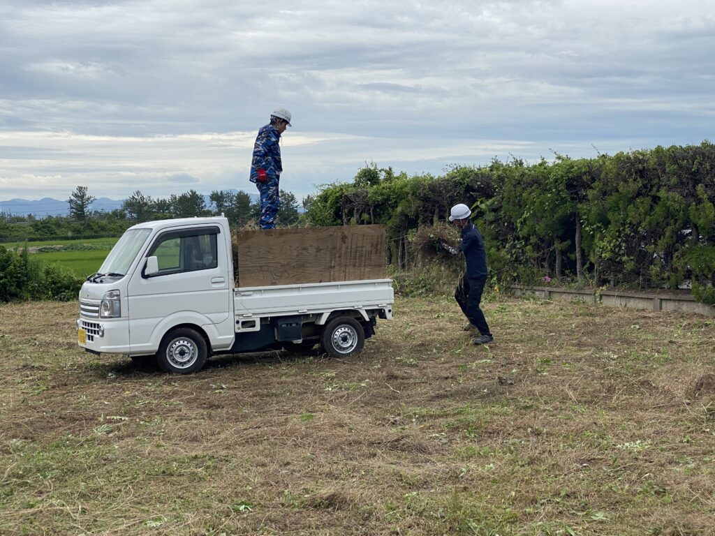 三人で、刈る係、集める係、積込み係と役割分担しながら作業をしました。